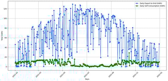 Figure 2 illustrates the energy performance of the kindergarten in 2021, reflecting the low-usage conditions resulting from the COVID-19 pandemic mitigation measures. The blue line illustrates the daily export of electricity to the grid, while the green line depicts the self-consumption levels within the building. During the summer months, when solar irradiance was higher, the PV system generated significantly more electricity, leading to notable peaks in energy exported to the grid. However, self-consumption levels remained consistently low throughout the year due to the building’s limited operations under COVID-19 conditions. This low internal energy usage highlights the effect of restrictions, as the kindergarten was not fully utilized during this period. The consistent gap between production (export) and consumption underscores the underutilization of generated energy for internal needs, emphasizing the impact of external disruptions on energy management and, potentially, the grid.