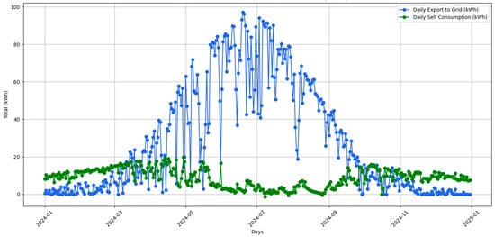 Figure 3 depicts the estimated daily energy performance of the kindergarten throughout 2024, representing high-usage conditions under stable and normal operational circumstances. The green line represents daily self-consumption levels, while the blue line indicates daily electricity export to the grid. During the winter months, when the kindergarten operates at full capacity, energy demand is higher due to heating and regular building use. The PV production during this time is primarily used for self-consumption, as shown by consistently higher green line values, while export levels to the grid remain minimal. In contrast, during the summer months, when the building is closed for school holidays, energy demand drops significantly. As a result, the PV system’s output is largely exported to the grid, reflected by higher blue line peaks.