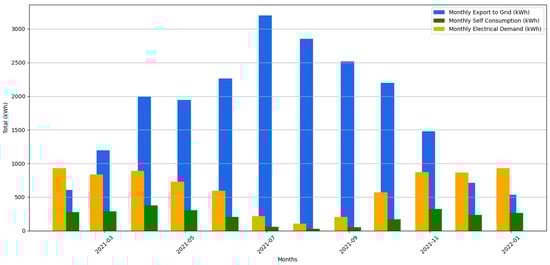 Monthly Export to Grid, Self-Consumption, and Electrical Demand during Low Usage (2021).