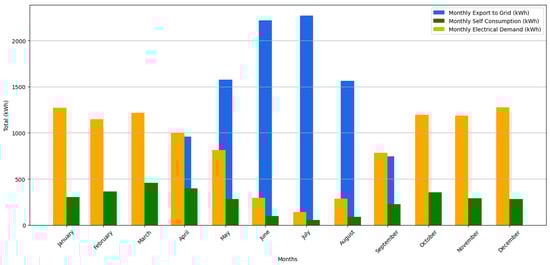 Figure 5 depicts the estimated monthly energy performance of the kindergarten under normal operational conditions, simulating a fully functional year (2024) without pandemic disruptions. The blue bars represent electricity exported to the grid; the green bars indicate self-consumed electricity, and the orange bars reflect the total electrical demand. Under high usage, the monthly electrical demand was significantly higher than during the low usage scenario, reflecting the kindergarten’s full operational schedule with regular occupancy and activity levels. Self-consumption was also notably higher, particularly during the winter months, as the PV system supported the increased energy needs of the building, including heating and lighting. During the summer months (June to August), the kindergarten’s energy demand dropped due to school holidays, leading to reduced self-consumption. However, the PV system continued to generate electricity at high levels due to optimal solar conditions. This resulted in a marked increase in electricity exported to the grid (blue bars), as surplus energy was fed into the grid when internal demand was minimal.