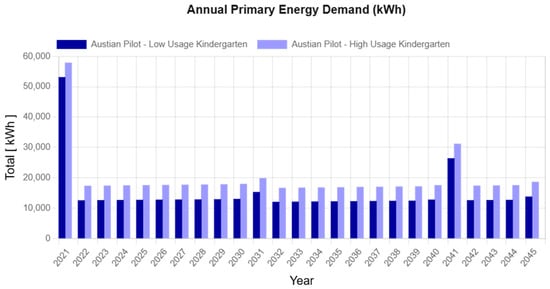 This analysis examined the kindergarten’s energy demand and the performance of its PV system under three scenarios. During the low-usage case, energy demand variations were influenced by changes in occupancy and usage patterns due to pandemic-related restrictions. Austria, including the Southern Burgenland region, experienced multiple lockdowns between March 2020 and December 2021, with schools and public buildings facing closures and limited operations during this period []. Detailed time series data, consisting of 8760 hourly final energy consumption measurements for the year 2021, were sourced from the AURORAL platform. These data covered key energy-related components, including the air conditioning (AC) system, heat pump, domestic hot water (DHW) system, PV system, and electrical consumption for lighting and other uses. The analysis specifically relied on the 2021 dataset, as it provided the most complete and representative time series available. This annual dataset served as the foundation for evaluating the building’s energy demand and the performance of its systems under hypothetical reduced usage conditions for a period of 25 years.