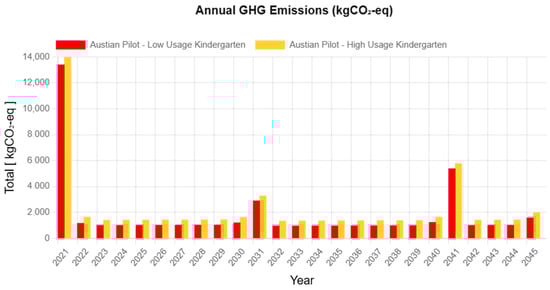 The results reveal significant differences in both Primary Energy Demand (PED) and Global Warming Potential (GWP) across the analyzed scenarios, reflecting the impact of operational intensity and energy upgrades. For Primary Energy Demand (PED), the baseline case (without PV installation) records the highest lifetime PED, reflecting the building’s full reliance on grid electricity. In the low-usage scenario, the lifetime PED was 29.7% lower than the baseline, driven by reduced occupancy and decreased energy demand during periods of limited kindergarten usage. Conversely, in the high-usage scenario, lifetime PED shows a 6.9% reduction compared to the baseline but increases relative to the low-usage case. This rise in PED under high usage is attributed to greater operational intensity and consistent energy demands under normal conditions. Under low-usage conditions, the GWP decreases by 25.7% compared to the baseline, primarily due to lower energy consumption during periods of limited occupancy. In the high-usage scenario, lifetime GWP is 8.2% lower than the baseline but 23.5% higher than the low-usage case, reflecting the increased energy consumption associated with higher operational intensity under normal usage conditions.