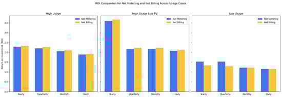 Figure 8 from the ROI analysis reveals that net metering consistently outperforms net billing across all usage cases, particularly under favorable conditions like yearly reconciliation, where surplus energy offsets cost on a 1:1 basis. In contrast, net billing undervalues exported energy, leading to comparatively lower returns. Yearly reconciliation achieves the highest ROI for both policies by aggregating surplus energy over an extended period, significantly reducing costs. However, as reconciliation intervals shorten to quarterly, monthly, or daily, ROI declines due to surplus energy being penalized or unused, which diminishes its cost-saving potential. For instance, in the High Usage scenario under net metering, ROI decreases from 2.29 (yearly) to 1.89 (daily), marking a 17.4% drop. When it comes to maximizing the financial benefits of the investment, the analysis also highlights the importance of appropriately selecting the PV system size under the constraint of covering the building’s energy needs. As observed in the High Usage Low PV case, the payback period is 6.01 years (yearly), and ROI is significantly higher compared to the full High Usage scenario, underscoring the importance of appropriately sized PV systems to optimize cost-effectiveness and ensure balanced economic outcomes.