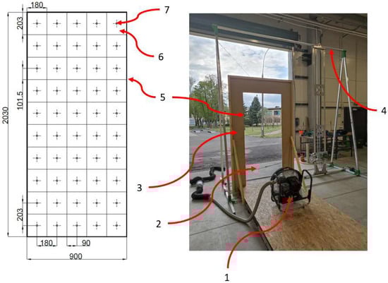 Test configuration, where 1—ventilator; 2—measurement probe (TSI Thermoanemometer); 3—door opening model; 4—frame with measurement device rails; 5—measurement plane; 6—area of the door opening for which the measurement is performed at the measurement point; 7—measurement point for a given area.