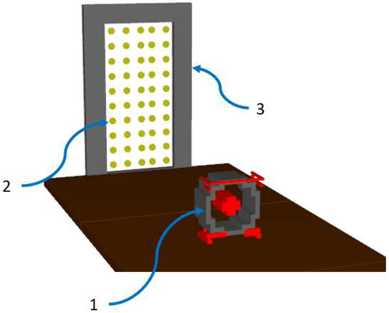 Visualization of the numerical model created for the simulation test to evaluate the characteristics of the airflow velocity profile on the surface of the door opening, where 1—positive pressure ventilator; 2—detector of airstream velocity; 3—mock-up simulating the door opening.