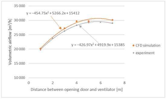 The characteristic of the volumetric flow rate of a positive pressure ventilator obtained during experimental tests in real conditions and CFD simulations at a test setup for evaluating the velocity profile of the airflow at the door opening surface.