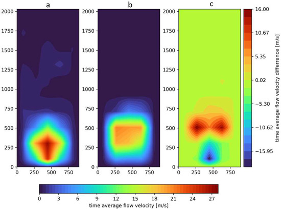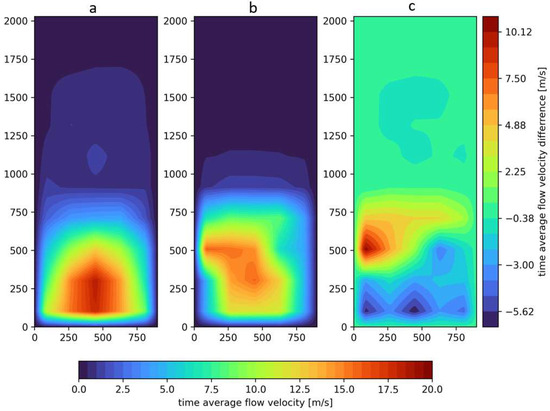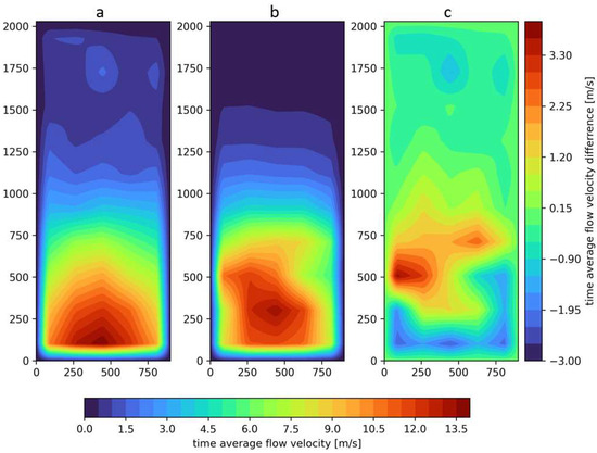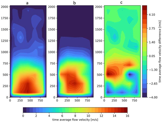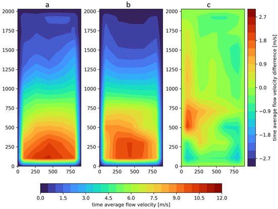 Characteristics of the airflow velocity profile of the positive pressure ventilator positioned 4 m from the door opening (measuring plane), where (a) real-scale experiment, (b) CFD simulation (FDS program), (c) difference between the experiment and CFD simulation.