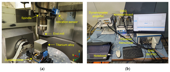 Experimental setup of machining center and data acquisition system for cutting force spindle vibration monitoring: (a) Machining center configuration with sensor and tool dynamometer placement; (b) Data acquisition system with software interface and signal processing units.