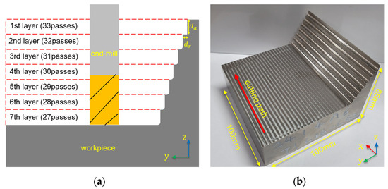 The machining path for the experiment was a linear pass along the x-axis for the first layer, as depicted in Figure 2a. After each pass, the tool advanced by the radial depth of cut () along the y-axis, repeating the same machining pattern. This process was repeated for a total of 33 passes, after which the tool returned to its initial position and moved by the axial depth of cut () along the z-axis to begin the second layer, continuing with 32 passes. As shown in Figure 2b, with each successive layer, the number of passes decreased by one, resulting in a stepped workpiece composed of seven layers (a total of 210 passes). Six workpieces were machined under identical conditions, and the side surface of each layer was examined under a microscope to monitor surface changes.