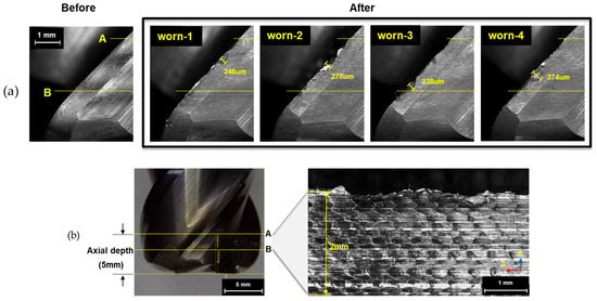 Tool wear condition and surface quality characteristics of the end mill: (a) Post-machining tool wear condition; (b) Positions affecting surface quality on the end mill.