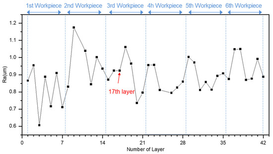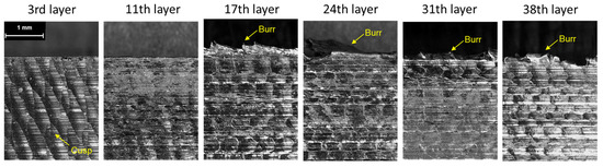 After completing the machining process, the tool wear of the end mill was measured. As shown in Figure 3a, all four cutting edges (flutes) exhibited wear exceeding 238 μm. Additionally, as observed in Figure 3b, the worn region was concentrated within the lower 2 mm of the free surface of the workpiece. To analyze the effect of tool wear on the machined surface, the surface profile was captured, and surface roughness was measured for each layer. As shown in Figure 4, regular cusp formations were observed in the initial machining layers. However, from the 11th layer, the cusps gradually disappeared from the upper part of the surface. By the 17th layer, burr formation began at the upper surface, and the previously regular cusp patterns were entirely eliminated. The occurrence of burrs increased as machining progressed, and as tool wear intensified, the surface profile became more irregular and rougher. Additionally, the average surface roughness (Ra) was analyzed for each layer, as shown in Figure 5. Initially, significant variations in Ra values were observed between layers, but these fluctuations gradually diminished. This trend is attributed to the effect of replacing the workpiece every seventh layer, causing variations due to material and tool positioning changes. However, from the 17th layer of the third workpiece, Ra values began increasing again, followed by a reduction in fluctuation. This indicates that as tool wear progresses, surface roughness stabilizes, which serves as an important indicator of the tool wear stage.