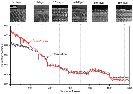 As shown in Figure 7, the correlation between x-axis force () and y-axis force ( for each pass was analyzed, revealing a decreasing trend in the correlation coefficient as the number of passes increases. Additionally, as seen in Figure 8, the variation in the correlation coefficient across passes shows a sharp decline during the first 400 passes, after which the correlation coefficient remains relatively stable. However, the correlation coefficient between and significantly decreases after the 17th layer (486–516 passes), which coincides with the point of reduced machining performance.