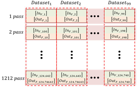 This dataset contains 99 data samples per pass, resulting in a total of 124,740 datasets across 1260 passes, as shown in Figure 11. Since LSTM models rely on sequential data, time-dependent variations must be properly structured for effective learning. To achieve this, the training dataset is divided into time-series segments, grouping temporal variations at each cutting position into 99 datasets. From the entire dataset, 80% (80 datasets) is allocated for training, while 20% (19 datasets) is used for validation. The dataset order is randomized during training to improve generalization, but the internal sequence within each dataset is preserved.