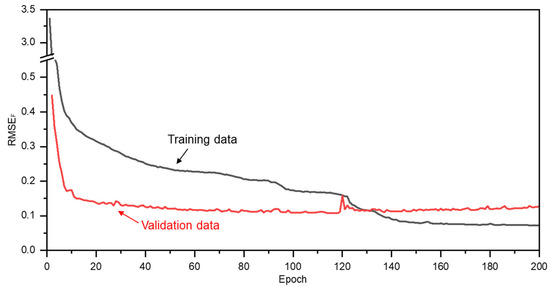 The training results of 200 epochs for cutting force estimation using the proposed model and dataset are shown in Figure 13. In the figure, the blue line represents the root mean square error of cutting force () calculated between the cutting forces obtained from the dynamometer (training dataset) and those estimated by the LSTM-based algorithm [27]. The red line represents the , calculated using the validation dataset. The definition of is provided in Equation (9):