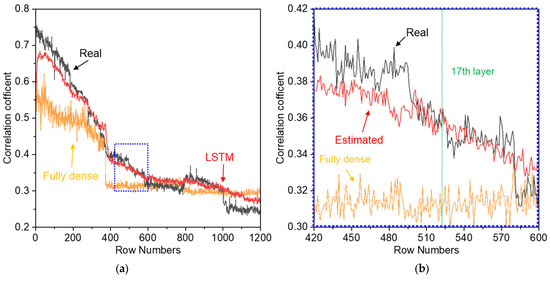 Correlation results estimated using the trained model: (a) correlation results for the entire pass; (b) correlation results for 420–600 passes.