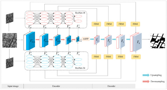 To achieve precise building area segmentation, numerous studies have been conducted. Prior to the widespread adoption of deep learning technologies, researchers mainly utilized four traditional methods for this task. The first method, based on threshold segmentation [9], distinguishes between building areas and the background by setting an appropriate intensity threshold. This method is simple and computationally efficient, but it is only suitable for situations with a significant contrast between building areas and the background and performs poorly in extracting complex background images. The second method uses edge detection [10] to extract edge information from building areas, thereby obtaining their contours. However, the extraction process is susceptible to noise interference, which can result in unclear contours of building areas. The third method employs the region-growing method [11], starting from one or more seed pixels in the images and gradually adding neighboring pixels with similar characteristics until all pixels are classified into the corresponding regions. While this method can effectively handle clear and uniform building areas, inappropriate seed points may lead to inaccurate region growth, which affects the final result. The fourth method is feature extraction [12], which involves extracting key features from images using manually designed algorithms and then classifying these features with traditional machine learning methods, such as support vector machines [13] and random forest [14]. Although this method performs well in terms of accuracy and interpretability, feature design is highly dependent on the researcher’s experience, and different scenarios may require different feature designs, which demand considerable time and effort. As artificial intelligence evolves, deep learning-based building area segmentation methods have significantly reduced the need for manual intervention and improved segmentation efficiency. As a result, an increasing number of researchers are dedicated to designing deep learning-based architectures for building area segmentation. However, due to the impact of geometric distortions and speckle noise in SAR images, most building area segmentation methods are primarily optimized for optical images, while methods for SAR images are relatively scarce. So far, building area segmentation from SAR images mainly relies on encoder–decoder architecture. The main idea behind this architecture is to gradually extract deep-level features of building areas using the encoder, subsequently using the decoder to transform the features into pixel-level segmentation results. Emek et al. applied the classic encoder–decoder U-Net architecture to segment building areas in SAR images, achieving decent segmentation results [15]. Jing et al. used an encoder with a selective spatial pyramid dilation structure and a dual-stage decoder, effectively showcasing details of large-scale building areas [16]. Peng et al. designed an encoder–decoder architecture combined with attention mechanisms to enhance the distinction between building areas and background, effectively locating building areas in SAR images [17]. Although these algorithms have good segmentation performance, there are also some limitations. On the one hand, these algorithms use a single convolutional neural network (CNN) for encoding SAR images during the encoding stage. However, owing to the interference of speckle noise and geometric distortions in SAR images, the single CNN struggles to effectively extract deep-level features of building areas. On the other hand, a single CNN typically uses continuous convolution and pooling operations to extract features, which can easily result in the loss of small-scale building area information.