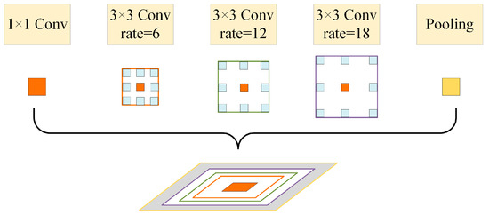 In practice, was first processed through a 1 × 1 convolutional layer, three 3 × 3 convolutional layers with dilation rates of 6, 12, and 18, and ASPP pooling, which included an average pooling layer, a 1 × 1 convolutional layer, and an upsampling operation. Subsequently, the outputs were concatenated, and a 1 × 1 convolutional layer was applied to reduce the channel number of the concatenated feature maps to match the channel count of , generating the processed feature map . Formally,