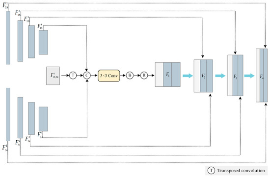 In practice, the encoder feature map was first processed with transposed convolution to increase its resolution to the feature space dimensions of the penultimate residual module in the Pseudo-Siamese fusion encoding network. Subsequently, the output was combined with the encoded feature maps and using a concatenation operation. Finally, the concatenated feature maps sequentially were processed through a convolutional layer with a kernel size of 3 × 3, a BN layer, and a ReLU function to produce the output of the first upsampling module. Formula 6 can be used to represent the calculation carried out in the first upsampling module, and the processing method for the remaining upsampling modules is similar: