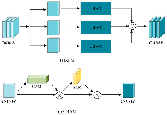 Given an input feature map, we divided it into three sub-feature maps , where t = 1, 2, 3 correspond to the three sub-features, respectively. Next, we applied the CBAM [26] to . The CBAM includes both a channel attention module (CAM) and a spatial attention module (SAM), which collaboratively enhance feature representations across both the channel and spatial domains. Specifically, was processed through max pooling and average pooling layers, generating two separate outputs. These outputs were then passed through a shared multi-layer perceptron (MLP), and their outcomes were summed. Next, the summed results were processed through a Sigmoid function to output the channel attention weights . Mathematically,