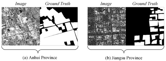 To assess the performance of PSANet in segmenting building areas from SAR images, we conducted experiments using the SARBuD 1.0 dataset produced by the team of the Chinese Academy of Sciences, which uses GF-3 SAR images as the data source and covers the land area of 20 provinces, cities, and autonomous regions in China. The dataset contains 60,000 sample images, each having a size of 256 × 256 pixels and a spatial resolution of 10 m. Considering the massive size of the dataset, direct use will consume a significant amount of computing resources and time. In addition, directly dividing the dataset into training and validation sets cannot accurately evaluate the model’s generalization ability in different geographical regions. Therefore, we selected Anhui Province and Jiangsu Province from the SARBuD 1.0 dataset for experiments, considering that these two regions have different geographical characteristics and significant differences in sample size, pixel spacing, and incident angle. Specifically, compared to Anhui Province, Jiangsu Province has a larger sample size, smaller pixel spacing, and a smaller incidence angle. These differences help in evaluating the model’s effectiveness under various conditions.