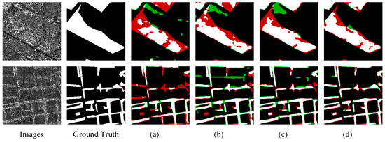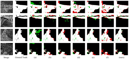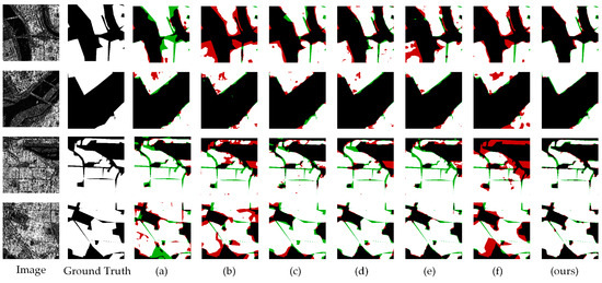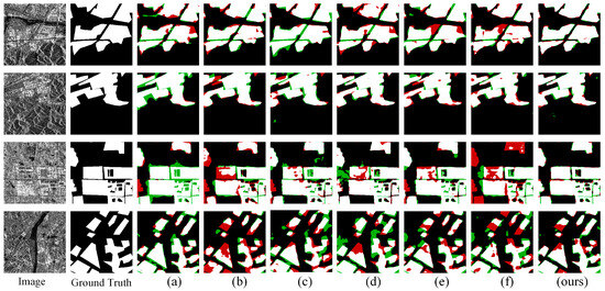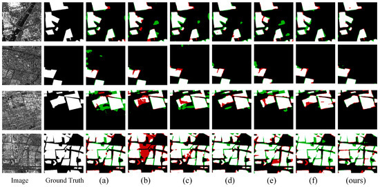 Figure 7 shows the segmentation results of four representative images from the Anhui Province test set, with red pixels indicating false negatives and green pixels indicating false positives. The seven methods displayed varying levels of error in segmentation results. Specifically, the results from methods (b), (e), and (f) contained a relatively large number of red pixels, indicating that these methods misclassified many building areas as non-building areas. The errors in methods (b) and (f) may stem from the lack of effective denoising techniques, making it difficult to suppress noise in the SAR data, thereby increasing classification errors. On the other hand, method (e) utilizes a transformer to capture global dependencies in the image, making it effective for processing large-scale regions. However, this also means that when handling complex areas where building regions are intertwined with the background, method (e) may struggle to accurately distinguish these differences, leading to classification errors. Meanwhile, methods (a), (c), and (d) contained a relatively large number of green pixels, indicating that these methods misclassified many non-building areas as building areas. The errors in methods (a) and (c) may stem from the use of a symmetric encoder–decoder architecture, which may result in excessive spatial smoothing during feature extraction, leading to the loss of detailed information. In addition, method (c) enhances feature extraction at different scales through a multi-scale feature fusion mechanism. However, in SAR images, the reflection characteristics of background areas are similar to those of buildings at certain scales, leading to the misclassification of these areas as building areas. Although our results contain some errors, which may stem from the model’s insufficient sensitivity to certain variations in the input data, such as noise or slight changes in pixel values, the total number of red and green pixels remains relatively small. In addition, by enhancing the reconstruction of building area details and the extraction of deep-level features of building areas, our method demonstrates superior segmentation performance for all building types in Anhui Province compared to other methods. This illustrates that our method outperforms others in segmenting building areas in Anhui Province.