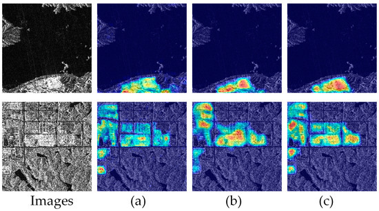 Figure 10 shows the attention heatmaps after each stage of the FRM, which were obtained by extracting the weights from the intermediate stages of the FRM using the Grad-CAM [39] method. It can be seen that when only the SAM was used in the FRM structure, the model can focus on the spatial structure of the building area, which is reflected in the heatmap displaying the complete outline of the building area. In addition, when only the CAM was used in the FRM structure, the model effectively focuses on the features of large buildings, which is reflected in the fact that large buildings are endowed with higher heating values. Furthermore, when the CBAM was introduced into the FRM structure, the model’s attention to building features in both the spatial and channel domains is optimized, which is reflected in the fact that the heatmap not only effectively shows the spatial structure of the building area but also assigns higher heatmap values to the building features.