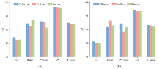 To evaluate the applicability of the CE-Dice in PSANet, we conducted comparative experiments by replacing CE-Dice loss with Focal loss [40] or Dice loss during the training process. Focal loss modifies the cross-entropy loss function by introducing a modulation factor, enabling it to assign greater weight to samples with fewer instances. Therefore, these loss functions can address the imbalance between the number of target-area and non-target-area pixels. Figure 11 shows the experimental results, from which it can be seen that CE-Dice loss outperformed the other two loss functions in terms of IoU, F1-Score, Precision, and OA in both regions. Focal loss may pose difficulties when dealing with small targets, as inappropriate focus factor settings can lead to insufficient learning of small targets. In addition, since Dice loss is calculated based on the degree of overlap, if the overlap between the ground truth and the predicted value is small in the early stages of training, it may affect the convergence speed and overall performance of the model. In comparison, CE-Dice loss effectively combines the advantages of cross-entropy loss and Dice loss, where cross-entropy loss ensures classification accuracy, while Dice loss enhances the focus on small targets, thereby improving segmentation accuracy and ensuring better training stability. This indicates that CE-Dice loss is more suitable for PSANet with regard to prediction accuracy and stability.