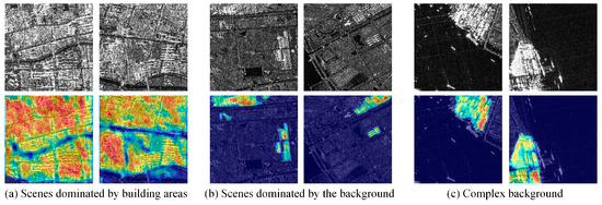 To more intuitively visualize the attention points of PSANet in the images, we used Grad-CAM to extract the weights from the model’s final convolutional layer, generating attention heatmaps. Figure 12 shows the heatmap results for different scenes, from which it can be observed that in building area-dominated scenes, PSANet accurately focused on the building areas in the images while also recognizing the complete boundary contours and assigning lower heat values to the blurry pixels along the boundaries. Meanwhile, in scenes dominated by the background, PSANet was still able to accurately focus on the building areas in the images. This illustrates that PSANet successfully learned the spatial and contextual information of the building areas, thereby enabling accurate recognition of the building areas in the images. In addition, when there were objects in the image with similar echo intensity to the building areas, PSANet was able to correctly classify them as background while preserving the integrity of the building area pixels. This illustrates that PSANet has strong robustness to effectively cope with complex backgrounds and noise interference, ensuring the accurate identification of building areas.