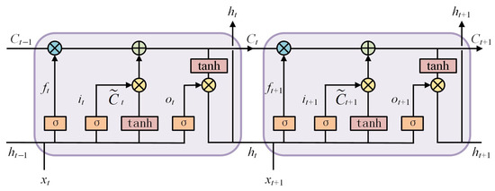 where is the current input vector, and denote the previous and current hidden states, respectively, and denotes their concatenation for computing gate activations and candidate states; , , , and together with , , , and are the weight matrices and bias vectors for the forget, input, candidate, and output gates; and tanh are the sigmoid and hyperbolic tangent functions, respectively; , , and are the outputs of the forget, input, and output gates; and is the candidate cell state used to update and form the new cell state .
