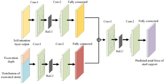 To extract the local spatial features of assembly steel strut axial force data and capture geological characteristics pertinent to foundation pit construction, this study employs a CNN for feature extraction. As illustrated in Figure 4, the temporal and spatial features of the axial force data are fused with geological features to form a unified representation that is subsequently processed by the CNN. This method facilitates the extraction of high-level features that capture complex spatial and geological relationships, ultimately enhancing the accuracy of assembly steel strut axial force predictions.