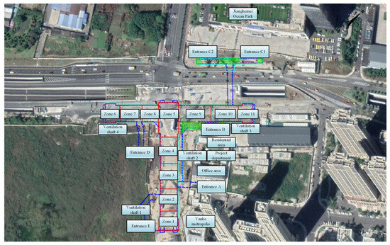 The deep foundation pit in this project pertains to the main excavation of the Sanbao Station on the SG9-3 section of the Phase I civil construction of Hangzhou Metro Line 9. Sanbao Station serves as a “T”-shaped transfer station between Line 6 and Line 9. The Line 6 section of Sanbao Station (Zones 1 to 5) is an underground four-story island-style station with a total length of 175 m and a standard width of 25.7 m. The Line 9 section (Zones 6 to 11) is an underground three-story island-style station with a total length of 201.2 m and a standard width of 24.5 m. Both sections adopt a double-column, three-span reinforced concrete box-frame structure with full waterproofing. The diaphragm walls and interior lining walls are designed as composite walls. The station is primarily constructed using the open-cut method. Entrance passages, ventilation shafts, and other auxiliary structures are mainly constructed using the open-cut method after the main structure is completed. For Entrance C, where it connects to the already constructed underpass tunnel, the horizontal freezing method is employed, followed by underground excavation. During the excavation and underground construction, special consideration is afforded to minimizing the impact on the surrounding environment. A schematic diagram of the environment surrounding Sanbao Station is shown in Figure 5.