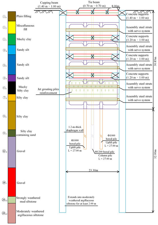 - Jiang, Z.; Zhu, S.; Que, X.; Ge, X. Deformation Effects of Deep Foundation Pit Excavation on Retaining Structures and Adjacent Subway Stations. Buildings 2024, 14, 2521. [Google Scholar] [CrossRef]