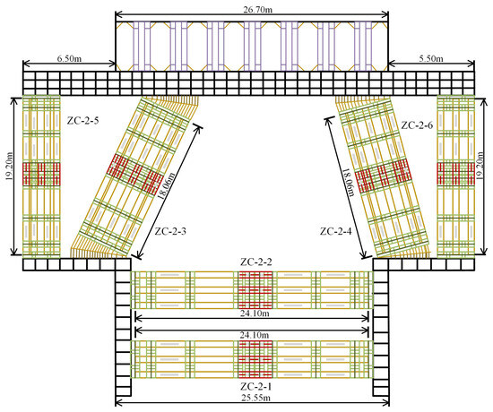 The standard section width of Zones 1 to 5 at Sanbao Station is 23.3 m, while the end shaft width is 27 m. Each steel strut weighs approximately 11.5 tons. The installation process for the steel struts involves pre-assembly on the ground, followed by segmented hoisting into the foundation pit using a 20-ton gantry crane, where the assembly is completed. In certain areas, manual chain hoists are used to assist with assembly adjustments. For the transfer nodes, steel struts are segmented and hoisted into the foundation pit using a 50-ton crawler crane, where they are subsequently assembled. The layout of the second layer of steel struts within the foundation pit is illustrated in Figure 7.