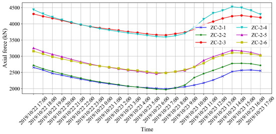 As shown in Figure 9 and Figure 10, the dashed-box areas correspond to the period between December 17 and 18, 2019, during which the axial forces of the assembly steel struts with a servo system exhibit a gradual decrease. This trend can be attributed to the progressive increase in the axial-force-bearing capacity of the newly cast concrete struts. Following the casting process, the concrete struts underwent a curing period during which their strength steadily increased, enabling them to take on more of the applied load. As a result, the load previously borne by the assembly steel struts with a servo system was gradually redistributed to the concrete struts, leading to a reduction in the axial forces of the steel struts.