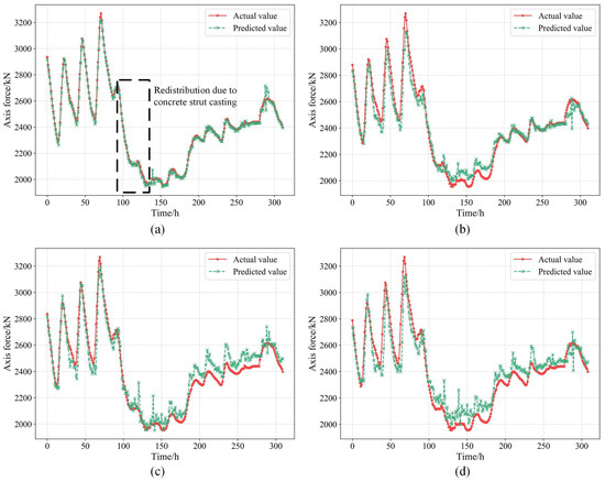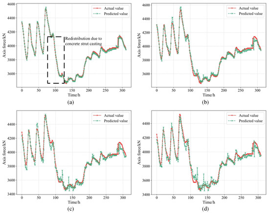 Table 1 presents the evaluation results of the axial force predictions for the overall performance across six assembly steel struts over the next 1 to 4 h. The model’s performance is quantitatively analyzed using RMSE, MAE, and . The results show that the model achieves low errors and high prediction accuracy for forecasts. However, as the prediction time steps increase, the errors gradually grow, leading to a slight decline in accuracy. For the 1 h prediction, the RMSE is 20.77, the MAE is 14.88, and reaches 0.99, indicating an excellent fit between the predicted and actual values. This level of accuracy effectively meets the monitoring requirements for dynamic changes in assembly steel strut axial forces in practical engineering scenarios. The low error within the first hour demonstrates that the model effectively leverages historical data to capture both local trends and overall fluctuations in axial force variations.