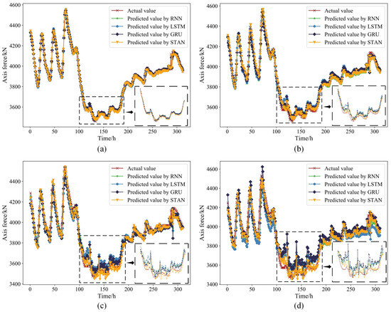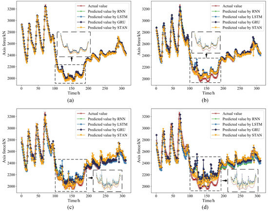 However, in the 2 h and 3 h predictions, the errors increase, with RMSE reaching 51.22 and 62.23, MAE rising to 38.39 and 46.60, and dropping to 0.93 and 0.91, respectively. Although the error growth is significant, the overall accuracy remains acceptable, and the predictions effectively capture the trends in assembly steel strut axial forces. For the longer-term 4-h prediction, the RMSE rises to 83.81, MAE increases to 59.94, and drops to 0.86, indicating a higher level of error. This suggests that, for longer prediction time steps, the model’s ability to capture local fluctuations diminishes, although it still accurately reflects the overall trend. The experiments demonstrate that the STAN model achieves low errors in predictions, meeting the accuracy requirements for monitoring and early warning of assembly steel strut axial forces. For medium- to long-term predictions, while the error increases, the model retains a certain degree of predictive capability, providing valuable references for trend analysis.