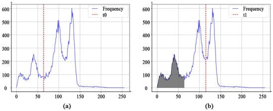 where S represents the total set of pixels within the image, while denotes the gray-level intensity of a pixel s belonging to S. The sets and represent the sets of object and background pixels defined by threshold t.
