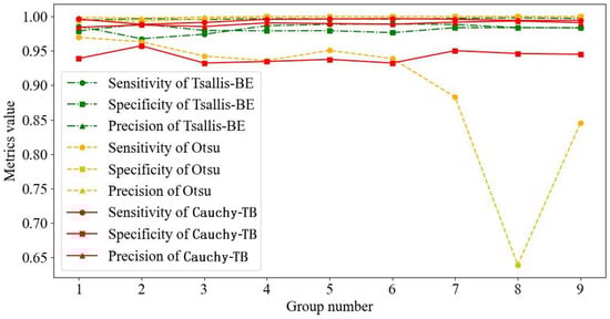 To quantitatively assess the performance of the proposed Cauchy-TB algorithm, we utilized statistical metrics such as sensitivity, specificity, precision, and accuracy to study the relationship between the segmentation outcomes and the ground truth. The Jaccard coefficient (JC) and the Dice similarity coefficient (DSC) are utilized to measure the overlap of the segmented region with ground truth. The formulas for calculating these metrics are as follows: