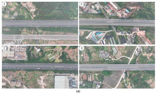 Trajectory data are important carriers of vehicle motion characteristics, and the lateral motion parameters of the vehicle can be resolved through the traveling trajectory, such as lateral displacement, lateral speed (the moving speed along the direction of the roadway cross-section) and lateral distance. To obtain trajectory data with sufficient sample size, a UAV is used to take aerial video shots of multiple scenes on two freeways in Chongqing, China (Figure 1a), and vehicle trajectories are extracted by computer vision technology. For fitting the purpose of the study, when labeling the vehicle dataset, all the models are simply divided into passenger cars (class “car”) and large trucks (class “truck”). Figure 1b shows the recognition performance of a single video frame, the interface only shows the “class–ID–speed” and the rest of the parameters are saved in the form of a table. Table 2 shows the basic information about UAV video recordings. The selected roads are all two-way six-lane freeways, with lane widths of 3.75 m. The UAV flies at an altitude of 300 m and captures video at a resolution of 4096 × 2160 pixels and a frame rate of 25 frames per second, covering a length of the roadway ranging from 405 to 419 m. It is worth mentioning that we have open-sourced part of the extracted data on http://www.cqskyeyex.com (accessed on 16 May 2023) and verified by comparing the driving trajectory of real vehicles that the extracted trajectory data can reach centimeter-level error [29], which is sufficient to meet the requirements of this work. The total length of the final valid video is 747 min, and a total of 34,404 vehicle trajectories are obtained, of which 27,334 are car trajectories and 7070 are truck trajectories. In addition to trajectories, the vehicle profile dimensions as well as the relative positions between neighboring vehicles are also extracted.