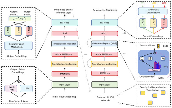 In this section, we present the InSAR-RiskLSTM framework Mixture of Experts, designed to integrate advanced spatial and temporal modeling techniques for precise railway deformation risk prediction. This framework comprises three core components: the Spatial Attention Encoder, the Temporal Risk Predictor based on LSTM, and the Feature Fusion Mechanism. These components work synergistically to extract meaningful spatiotemporal features, model sequential dependencies, and synthesize information for accurate risk assessment.