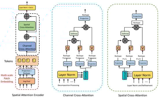 where , , and are linear projections of the input features X, and is the dimensionality of the key vectors. The output from this stage undergoes layer normalization and concatenation to prepare for spatial cross-attention.