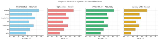 The proposed model exhibits superior performance compared to existing state-of-the-art (SOTA) methods across all datasets, as evidenced by the results presented in Table 1 and Table 2. In the Hephaestus and xView3-SAR datasets, our model achieved higher accuracy, recall, F1-score, and AUC, indicating a strong advantage in both detection and classification tasks. For example, on the Hephaestus dataset, our model reached an accuracy of 93.12% with an AUC of 92.63%, outperforming the closest competitor, InceptionTime, by a margin of nearly 2%. This improvement underscores the effectiveness of our model’s architecture, which integrates both temporal and spatial features through attention mechanisms, enabling it to capture intricate details in SAR images that are challenging for conventional models like LSTM and GRU.