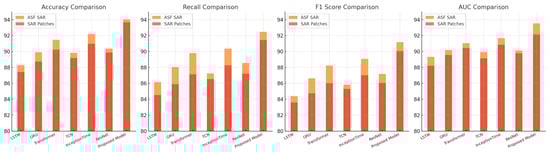 Figure 5 and Figure 6 further validate the robustness of the proposed model in environmental and terrain classification, as shown in the ASF SAR and SAR patch datasets. Here, our model demonstrated remarkable gains, achieving 94.03% and 93.67% accuracy, respectively, values that are significantly higher than those of the SOTA models. This improvement is particularly notable in recall and AUC metrics, where high values indicate the model’s reliable detection of small objects in cluttered SAR scenes. These results can be attributed to the model’s advanced feature extraction capabilities, supported by its multi-head attention components, which enable a thorough contextual understanding across patch-based and full-image resolutions. Compared to conventional architectures, our approach is more adaptable to variations in SAR patch composition and structure, effectively distinguishing between diverse terrain elements.