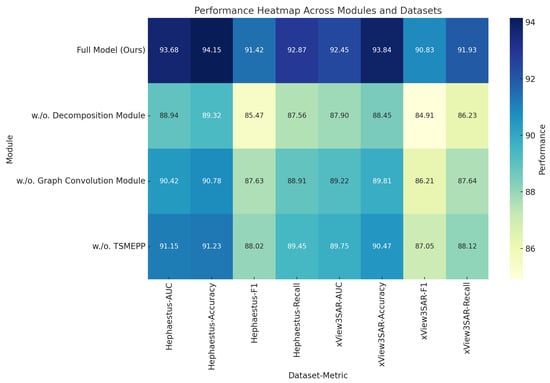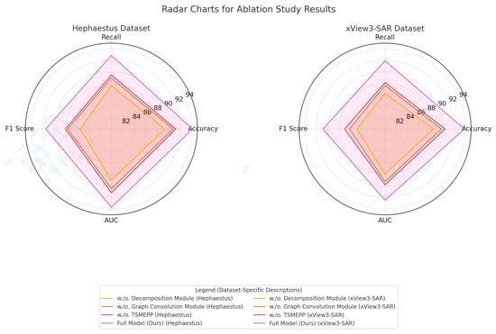 In the Hephaestus dataset, removing Decomposition Module resulted in a noticeable performance decrease, with accuracy dropping from 94.15% to 89.32% and F1-score declining from 91.42% to 85.47%. Decomposition Module, designed for spatiotemporal attention, appears to be essential for capturing the fine-grained temporal dependencies unique to SAR time-series data. The absence of this module reduces the model’s ability to accurately capture long-term dependencies, which are critical in scenarios involving complex spatial structures and subtle environmental changes in SAR imagery. Similar trends are observed in the xView3-SAR dataset, where the full model achieved an AUC of 92.45%, outperforming the AUC of 87.90% observed in the absence of Decomposition Module, further reinforcing its importance in enhancing precision and recall for maritime detection tasks.