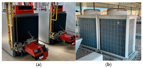 These university buildings under study were constructed in two phases. Building 1 (B1) was built and commenced operations in 2012, utilizing a Low-Temperature Condensing Boiler (LTCB) for winter climate control and a VRF air conditioning system in a small administrative area of the building. Building 2 (B2) was constructed in a subsequent phase and began operations in 2021, employing VRF for winter climate control. Figure 1 and Figure 2 show some of the energy systems of the buildings under study.
