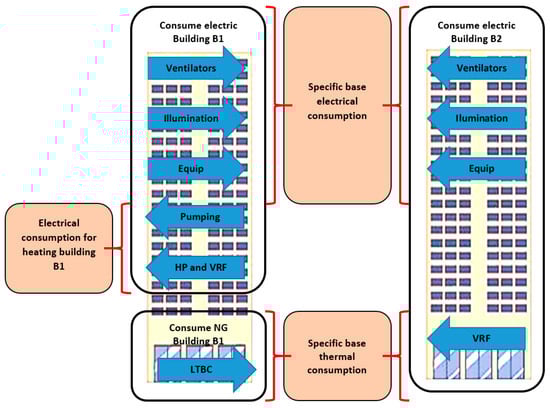 Table 2 provides an overview of the main energy-consuming equipment and installations in Building B2 considered in this study. Building B2 is similar in terms of construction, use, orientation, and conditioned areas to Building B1, except for the energy generation system, which in Building B1 is low-temperature and condensation boilers, and Building B2 uses a VRF system.