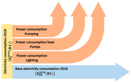 The consumptions are carried out with the same considerations as those made for determining the base consumption of B1, as described above. It is assumed that the specific base electricity consumption from 2018 will remain constant in 2022. The results of each consumption term are presented in Table 10.