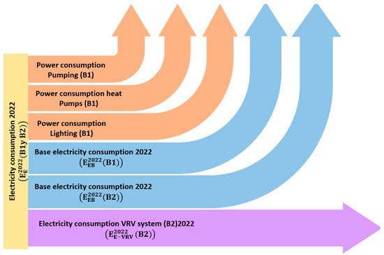 To determine the electricity consumption of the VRF systems during the winter period in Building B2 in 2022, it is considered that the energy consumed in 2022, during which both buildings (Buildings B1 and B2) were operational, is distributed as indicated in Figure 5.