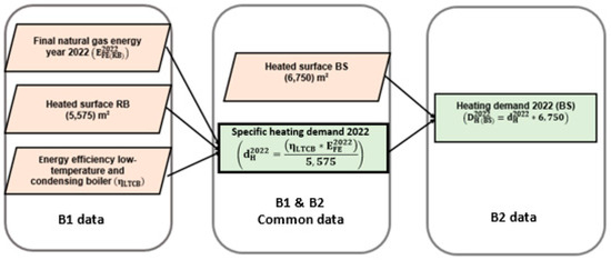 To enhance the reliability of the calculation, a calibrated energy model for Building B1 was developed and validated against the monitored gas consumption data. This model incorporates thermal properties, occupancy schedules, and local climate data to simulate building performance under the observed conditions. The specific heating demand for B1 in 2022 was then calculated based on the heated surface area and, subsequently, the same method was implemented in Building B2.