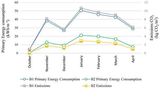 Regarding primary energy consumption and emissions, the results obtained (Figure 7) indicate that in all cases, the primary energy consumed by the VRF system installed in Building B2 is lower than that consumed by the LTCB system installed in Building B1 throughout all heating months. Additionally, the emissions from the Building B1 system are higher than those from the Building B2 system.